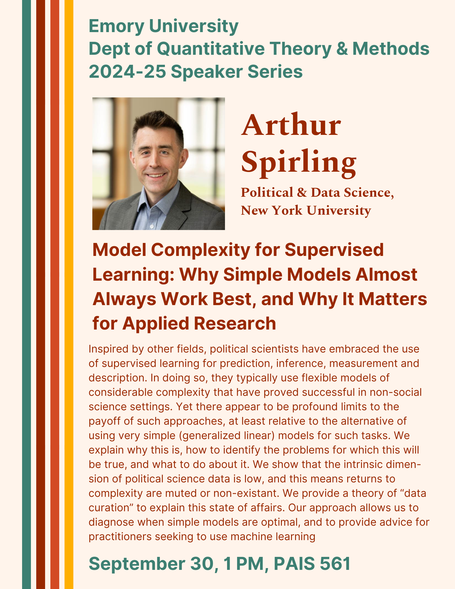 Monday, September 30th 1:00PM | PAIS 561 | Arthur Spirling | Model Complexity for Supervised Learning: Why Simple Models Almost Always Work Best, and Why it Matters fcor Applied Research. |
