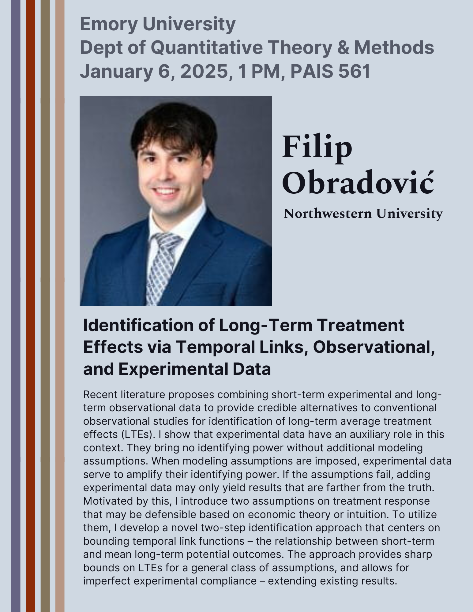 Monday, Jauary 6th 1:00PM | PAIS 561 | Philip Obradovic | Identification of Long-Term Treatment Effects via Temporal Links, Observational, and Experiemental Data |