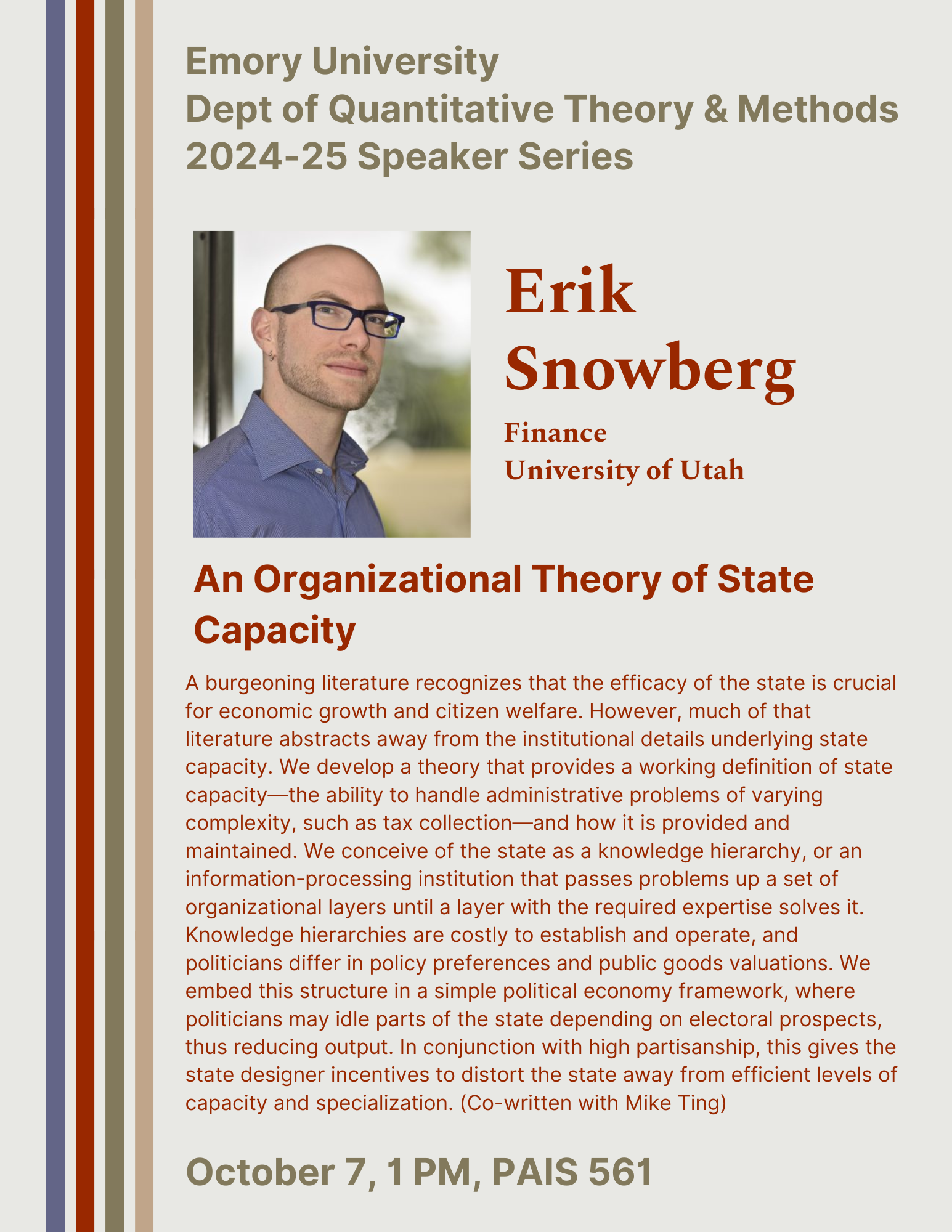 Monday, October 7th 1:00PM | PAIS 561 | An Organizational Theory of State Capacity | |